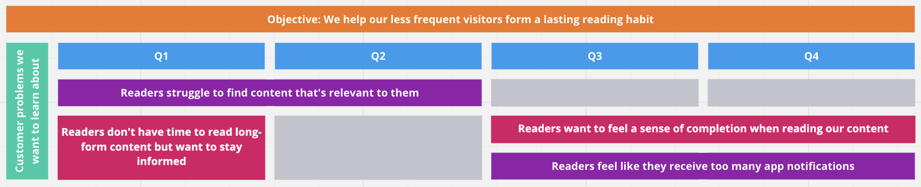 With this roadmap, the focus is on customer problems that you have identified during research and product discovery. Some larger problem areas may take multiple quarters to learn about. The objective is still front and center here: