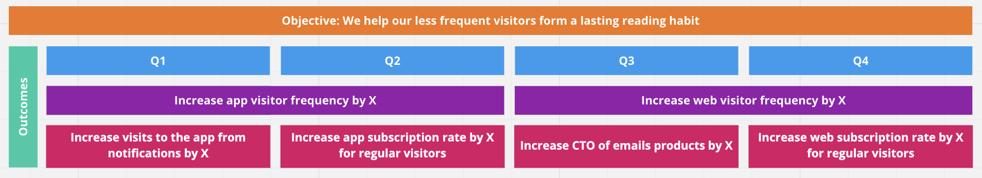 You might have one objective that lasts across several quarters or several outcomes that span the same timeframe.