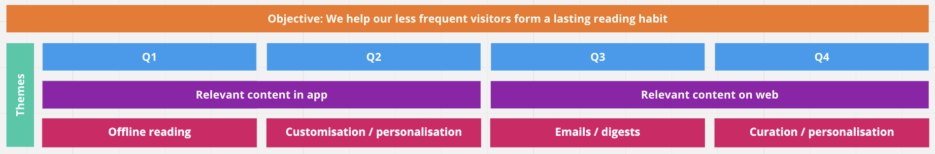 Both high-level themes (in purple) and sub-themes (in pink) are shown here, along with the overarching objective that spans several quarters. There will be a lot of detail that sits underneath each theme, but it’s not always helpful to include that here – again, the onus is on keeping it high-level and flexible: